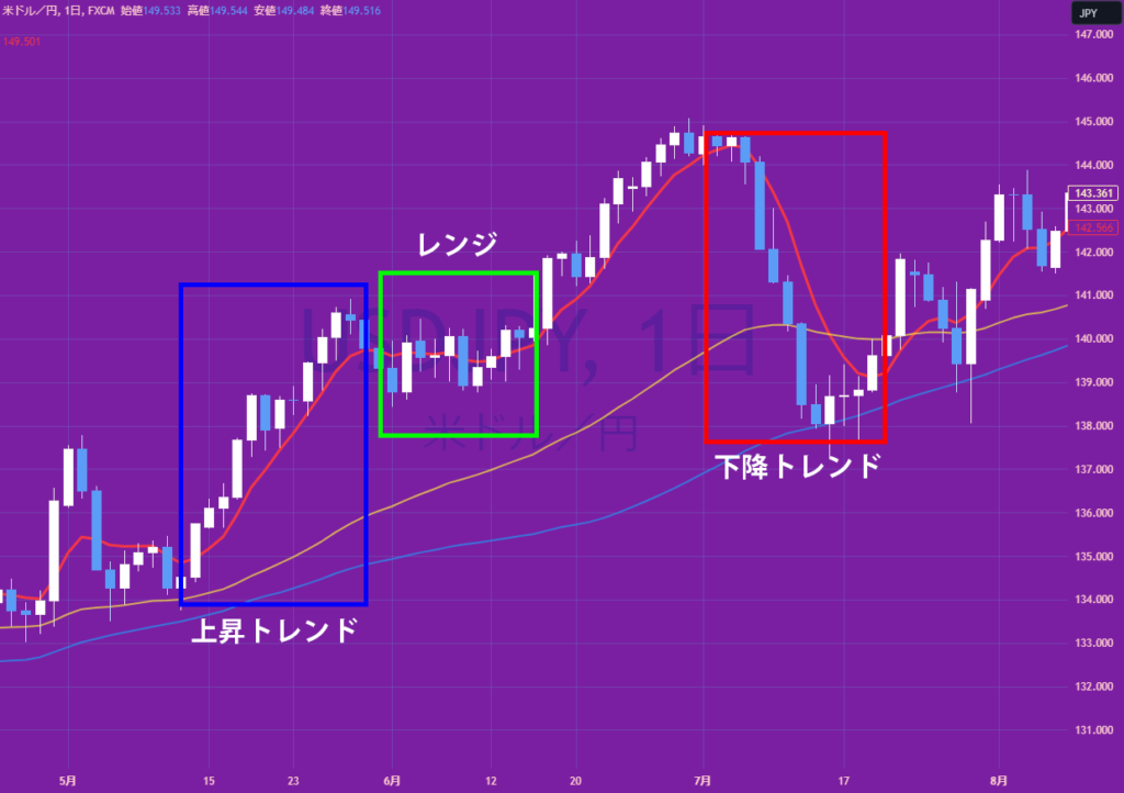 また、ローソク足の位置関係もトレンド分析において重要です。ローソク足が移動平均線より上に位置している場合、市場は上昇トレンドにあると見なされます。反対に、ローソク足が移動平均線より下に位置する場合は、下降トレンドが存在すると考えられます。ローソク足と移動平均線が頻繁に交差する、または密接に絡み合う場合、市場はレンジ相場(方向性がはっきりしない相場)にあると判断されることがあります。