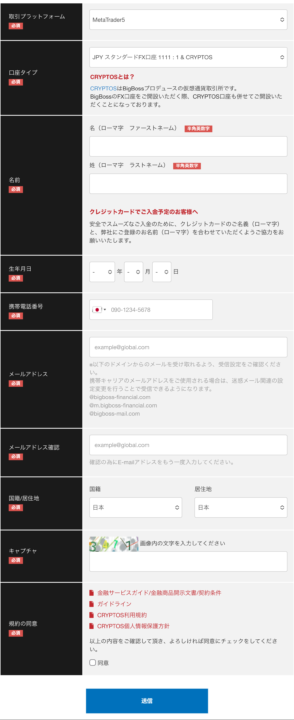 | 口座タイプ | スタンダード口座もしくはプロスプレッド口座から選択します。USDかJPYを選択できますので、基軸通貨として使用する方を選んでください。 |