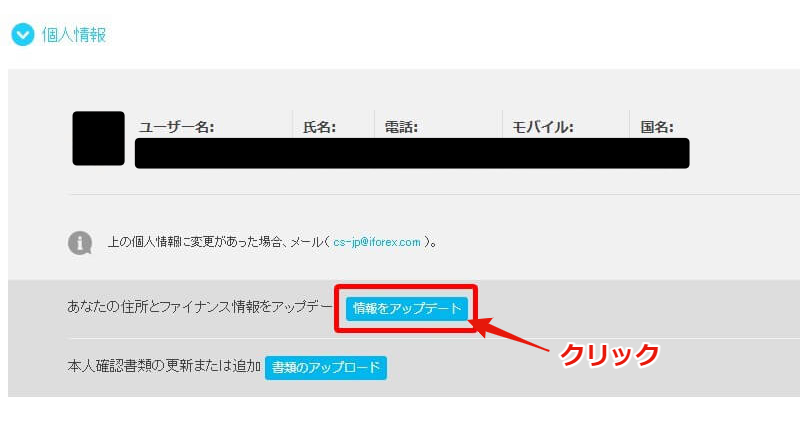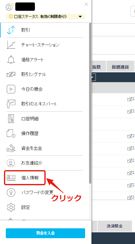 メニューから個人情報をクリックし、個人情報ページを表示させます。