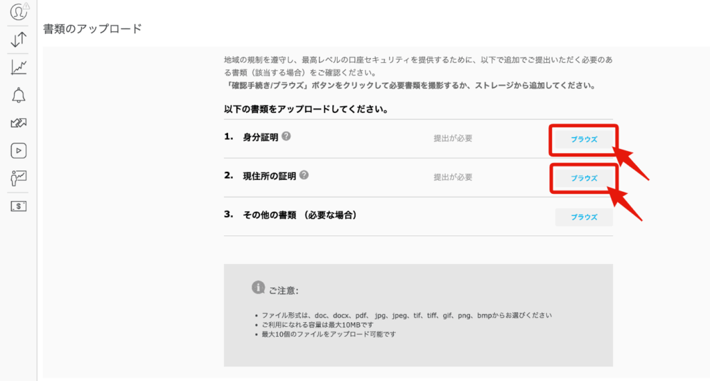 クレジットカードやデビットカードを使用して入金する方は、カードの画像をアップロードする必要があります。その際は「3.その他の書類(必要な場合)」にアップロードしてください。