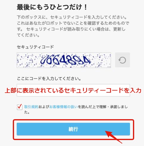 【口座開設】をクリックすると、下記のような画面が表示されますので、セキュリティーコードを入力したら取引規約などを読み、チェックボックスにチェックを入れたら続行をクリックします。
