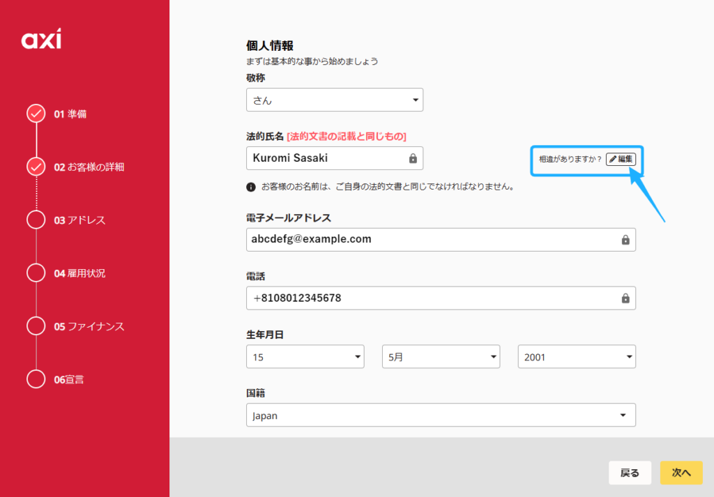 先ほど登録した氏名連絡先が自動で入力されているので、間違いがないか確認します。