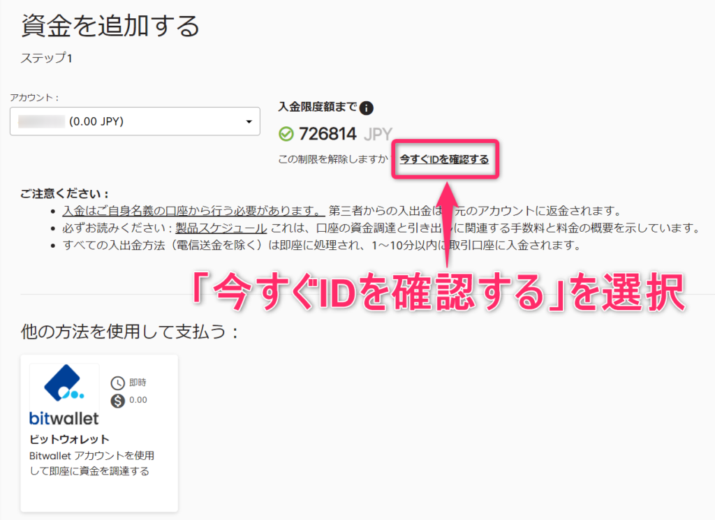 ログインすると「口座に入金する」というバナーが表示されるので、「資金を追加する」をクリックします。