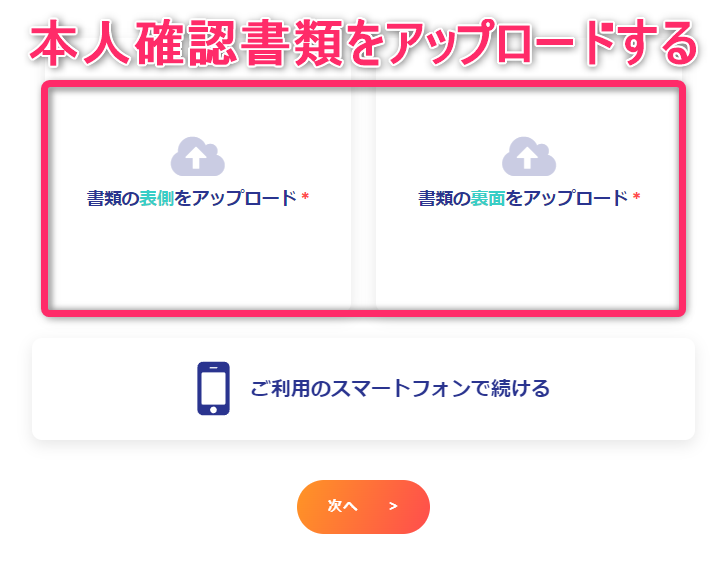 スマホで本人確認を行う場合は「ご利用のスマートフォンで続ける」を押して指示に従ってアップロードを進めてください。